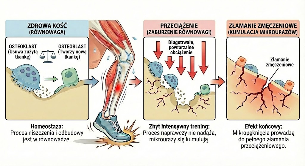 W zdrowej kości osteoklasty usuwają zużytą tkankę, a osteoblasty tworzą nową. Jeśli jednak trening jest zbyt intensywny lub obciążenia rosną zbyt szybko, proces naprawczy nie nadąża – w efekcie mikrourazy się kumulują, prowadząc do pełnego złamania przeciążeniowego.